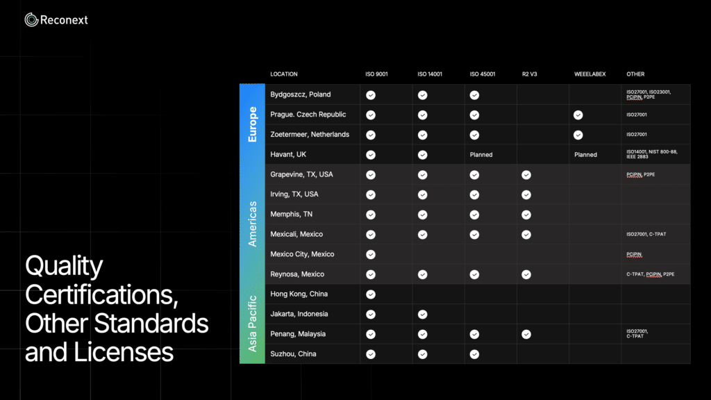 As part of our ongoing audit cycle, Reconext recently completed scheduled certification renewals and audits at select facilities. Together, these milestones reflect the consistent focus on operating discipline, accountability, and transparency we uphold across our global network.
