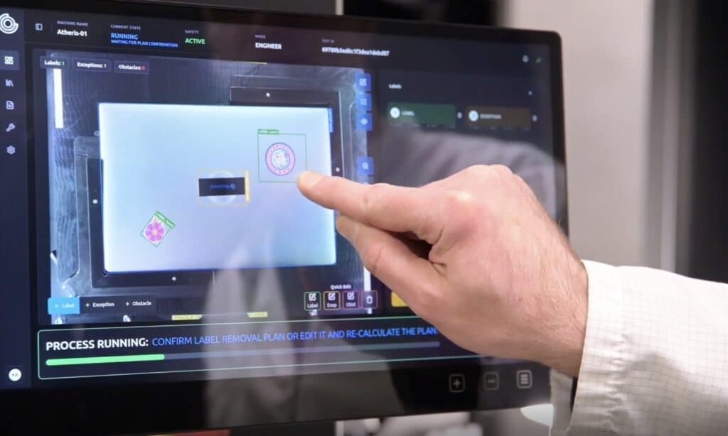 Atheris combines vision, motion, and thermal control to remove labels without damaging device surfaces.