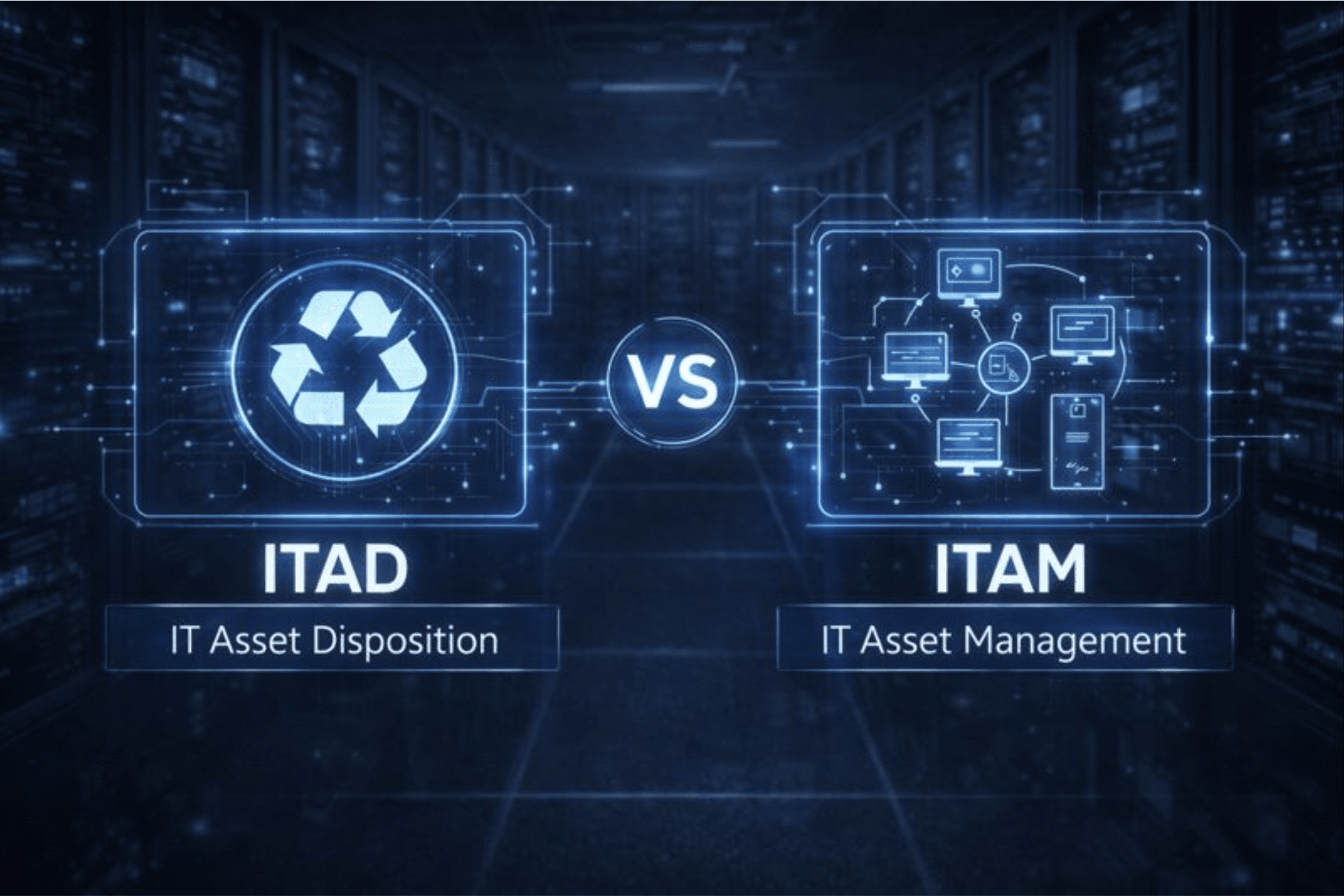 IT Asset Management (ITAM) controls technology assets while they’re in use, tracking and managing them, whereas IT Asset Disposition (ITAD) controls risks at asset retirement, ensuring secure disposal and responsible handling of retired IT assets.