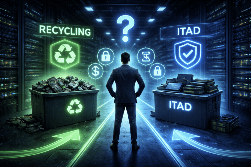 It depends on the equipment and the organization’s priorities. Recycling tends to optimize for the lowest immediate cost, while ITAD optimizes for total financial outcome by combining recovered revenue with avoided risk and internal effort.