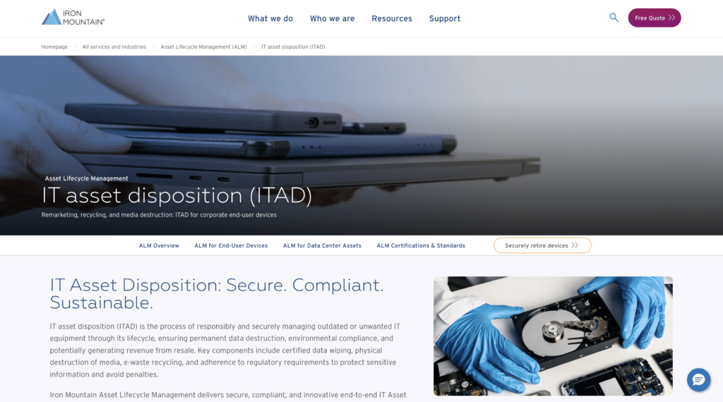 Iron Mountain is a global information management company that includes IT asset disposition within its broader Asset Lifecycle Management portfolio. ITAD supports its core focus on data protection, secure logistics, and regulatory compliance. The company serves multinational enterprises and regulated industries, including support for end-user computing devices and data center environments.